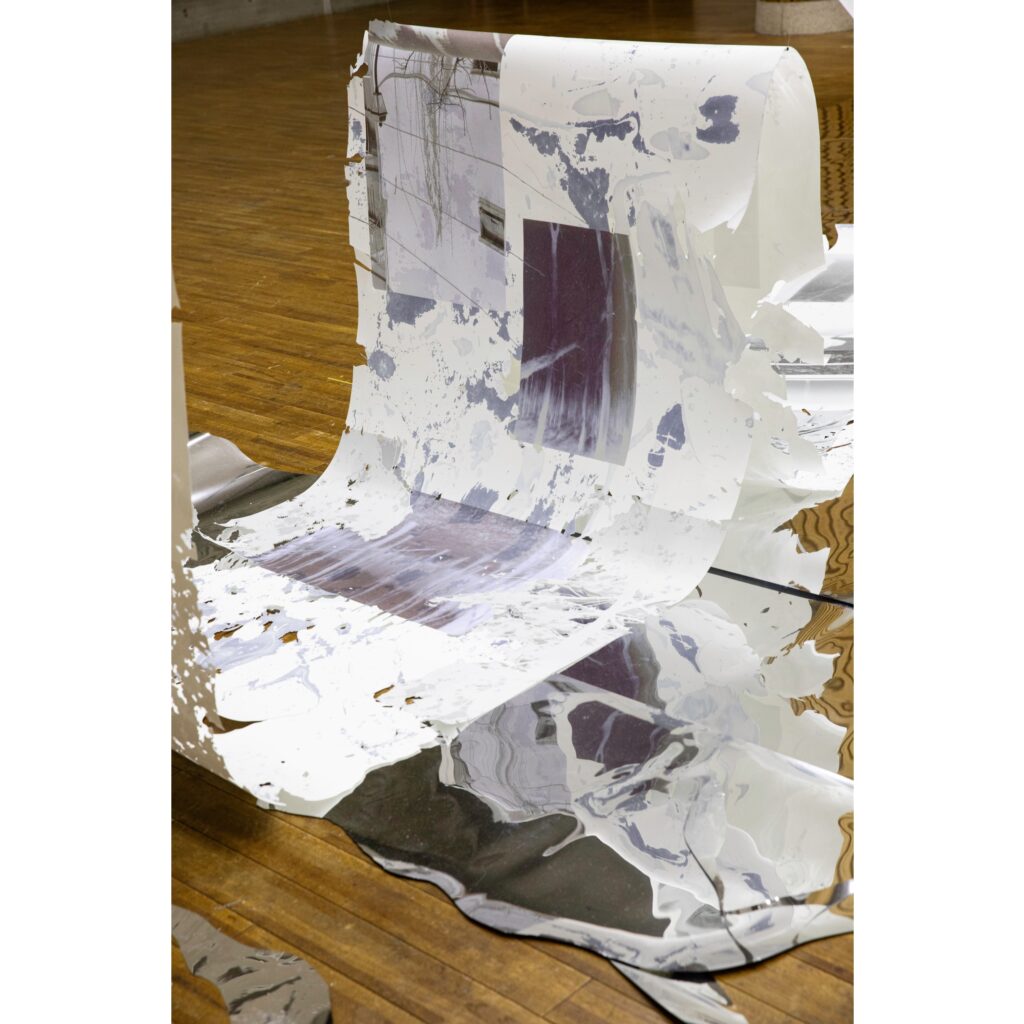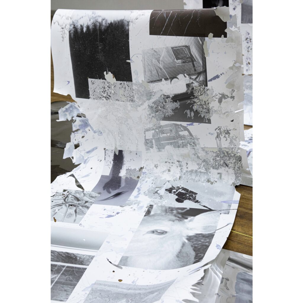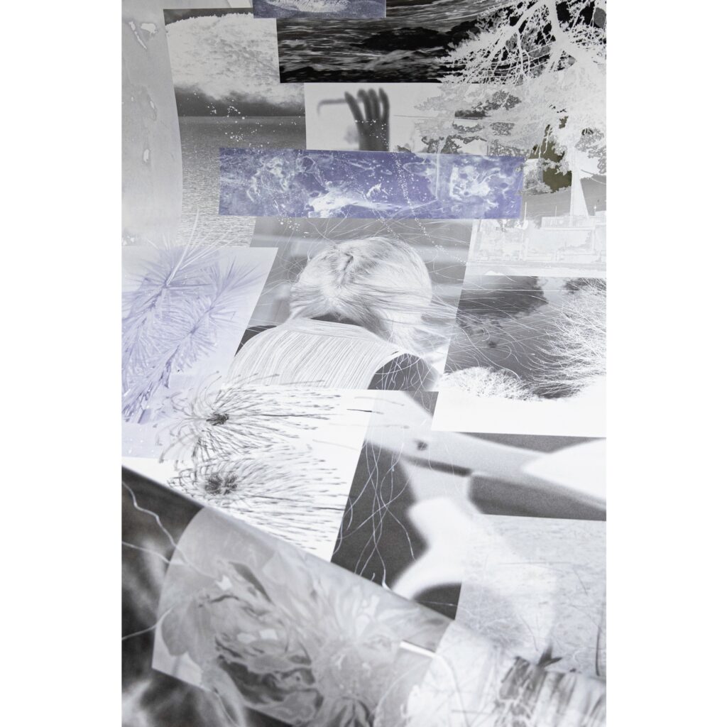 謝岳静は、「自己とは何か」を主題に、写真と絵画の融合した表現を追求しながら、鏡を媒介したインスタレーションを主に制作する。鏡面にフィルムを置き、墨でドローイングを施し、重層像としてスキャンする——こうしたコラージュの手法は、謝の独自技法である。鏡に映る虚像や視覚と内面のズレに着目し、現実と非現実の境界が曖昧に揺らぐ瞬間に、流動する自己の姿を見出そうとしている。そうした自己像の揺らぎは、現代社会における自己認識やアイデンティティの不確かさとも深く関わっている。